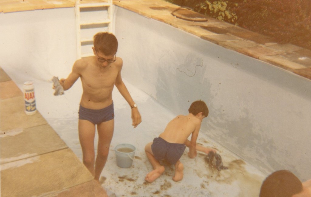 It would start with the first hot day in May, when Rob and Rik would clamour for the use of the swimming pool. A pump and hosepipe siphon would be set to work to drain away the green sludge. In we would go, in the blazing heat, with buckets, mops, cloths and dustpans to scoop out the last of the sludge, and marvel at the myriad wriggling creatures. Then we would scrub the sides to a gleaming sky blue, and Dad would patch any holes.