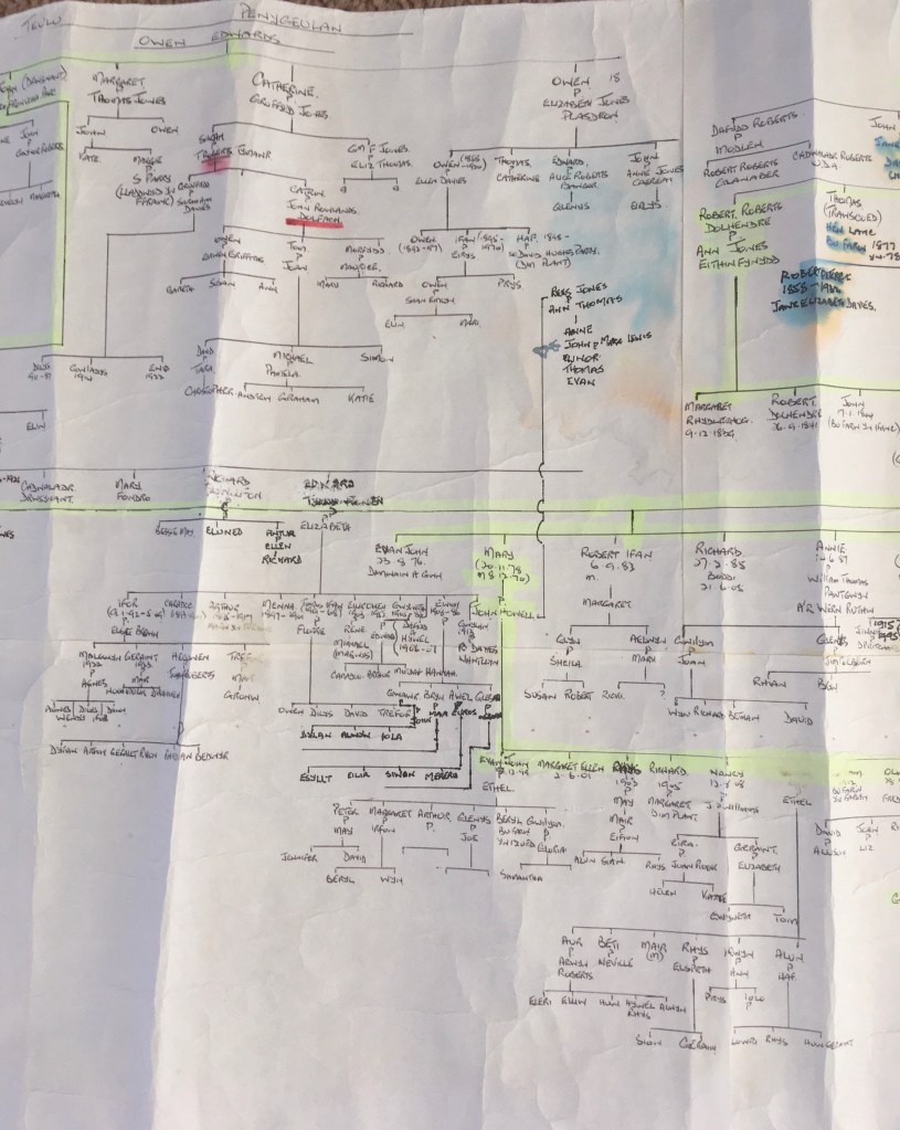 Arthur is the fount of all knowledge about the Llanuwchllyn tree, and I wasn’t the first visitor hungry for family stories. On seeing a photo of his grandmother Elin, who died was Arthur was thirteen, he volunteered “I don’t think she had a tooth in her mouth!” He keeps an extensive family tree on a long paper scroll, much consulted by local genealogists.