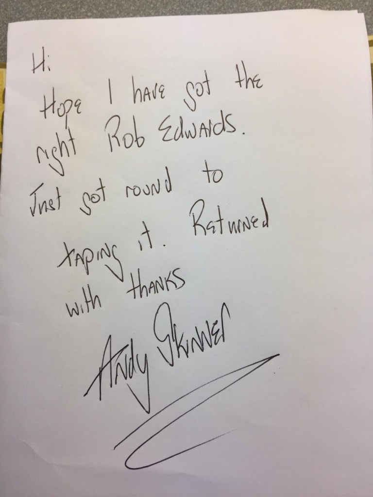To Andy’s surprise, he did find Tracks of My Tears when he searched in his loft, so he dispatched it to Rob’s address with exactly the message you would send when returning something after 49 years.