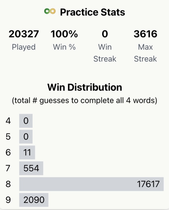 Well, Angus’s competition arrived…by 9th April 2026 Wil from Tucson, Arizona had amassed a practice streak of 3616, before his run came to an end: “not because I hit an unsolvable set of words, just a mistake. I thought a G was a C and entered CRAFT instead of GRAFT” and ran out of guesses. As Wil said, it is very difficult to maintain focus for thousands of games – at some point a mistake happens.