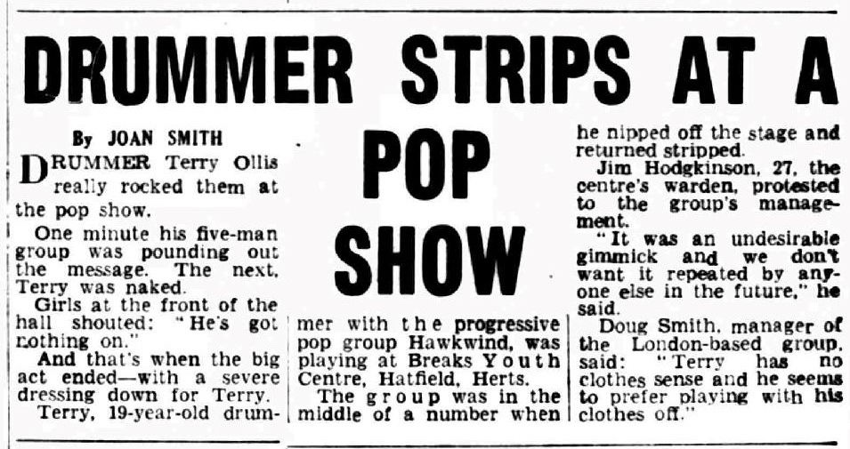 Rob and Stuart were entitled to believe the pedicure they witnessed was a normal event in the life of a rock band. But a look at the history of the band gives us an opportunity to reinterpret this scene: the other band members may have seen the seeds of a problem in their drummer’s behaviour. At nineteen, Ollis was just a year older than the sixth formers who had organised the gig, but more than ten years younger than band founder and leader Dave Brock. In January 1971 Ollis got his kit off again – this time on stage – and the story made the national press.