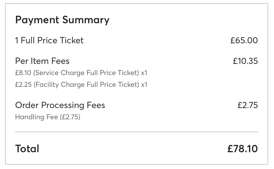 Do you remember when you could just pay the ticket price? Or perhaps phone and speak to a friendly person at the venue box office, who would post your tickets out for a small charge? Now Ticketmaster, the company which holds live music to ransom, makes you download their beastly app – you can’t even print at home. And if you don’t have a smartphone, you’re stuffed. There’s a lot of work, and you have to do it all yourself. So what are all these charges about? Service Charge – what service? Facility Charge? You would think that the venue’s costs would be in the basic ticket price. Handling fee? No-one’s handled anything. The customer has just spent a stressful 20 minutes struggling with their stupid website. So they’ve added 20% to the ticket price for nothing. Utter bullshit.