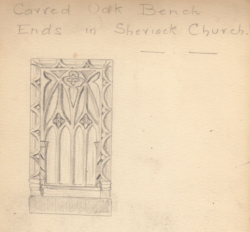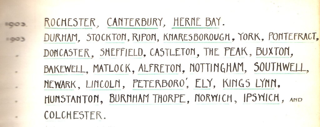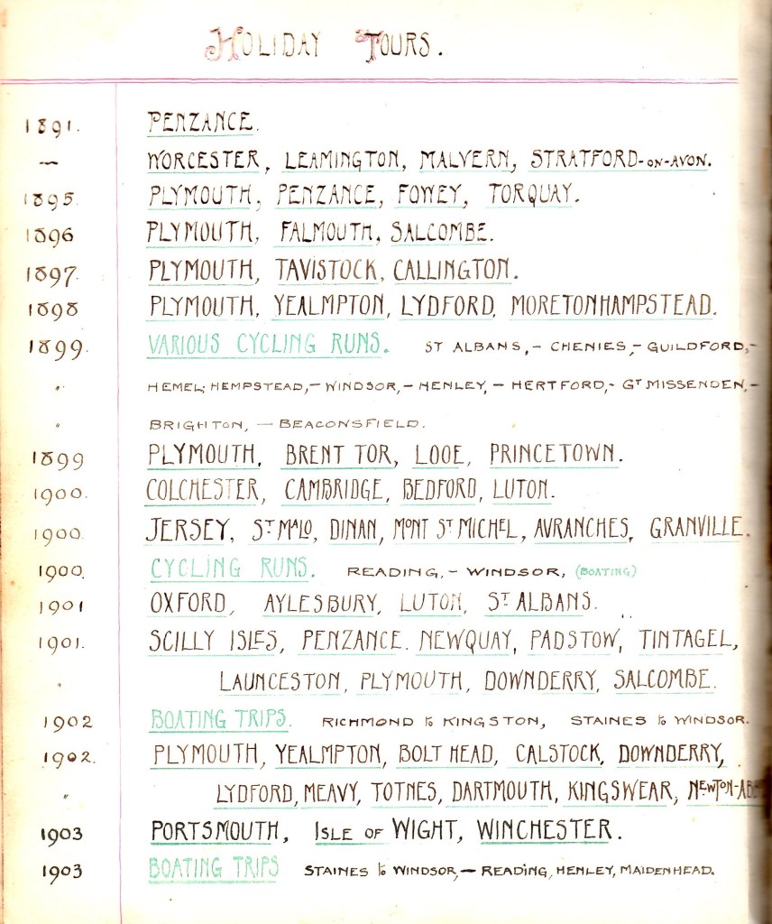 Harry Bond was Debbie’s maternal grandfather. He made a meticulous record of holidays he took between the ages of 11 to 21, from 1891 to 1901, by train, boat and bicycle. Two were from 1891: the others were all 1895 or later. His trips were mostly around England, including Devon, Cornwall and many places closer to London. One trip took him to Jersey and Brittany. The hardback journal is beautifully written, and illustrated with two pages of wonderfully detailed pen-and-ink drawings. The detailed narrative begins in September 1891 and ends abruptly – in Luton – on Easter Sunday, 1901 – about three months after the death of Queen Victoria. The summary list of holidays then extends to 1905, but with no corresponding narrative.