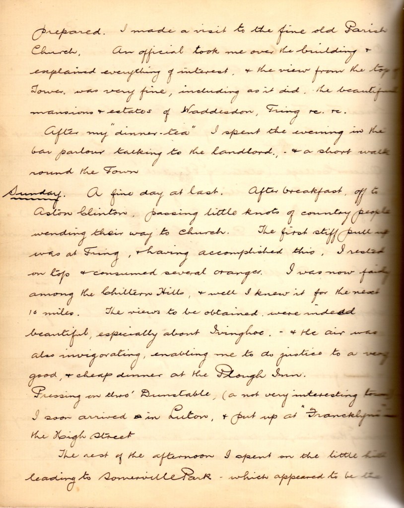 Sunday. A fine day at last. After breakfast, off to Aston Clinton, passing little knots of country people wending their way to church. The first stiff pull up was at Tring, & having accomplished this, I rested on top & consumed several oranges. I was now fairly among the Chiltern Hills, & well I knew it for the next 10 miles. The views to be obtained were indeed beautiful, especially about Ivinghoe, – & the air was also invigorating, enabling me to do justice to a very good & cheap dinner at the Plough Inn.