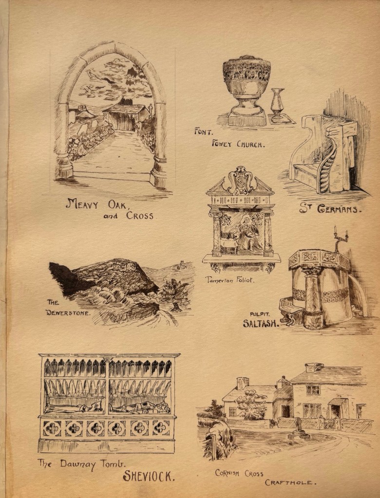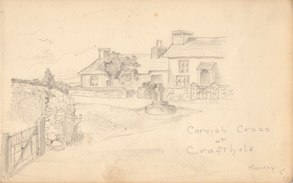 Another trip was made to Mousehole, the western point of Mount’s Bay. Walking through Wherry Town, we passed Newlyn, a picturesque fishing village & one much resorted to by artists. Arriving at Mousehole we had refreshments, & obtained a guide to the Cavern. The descent of the cliff was decidedly dangerous but at last, we were all safe in the cave, admiring its beauty. The roof and sides were simply smothered in delicate ferns, & the view out to sea was grand. After satisfying our guide his request for a larger ‘tip’, we decided to go a different road home, & soon found ourselves in St Paul Village.