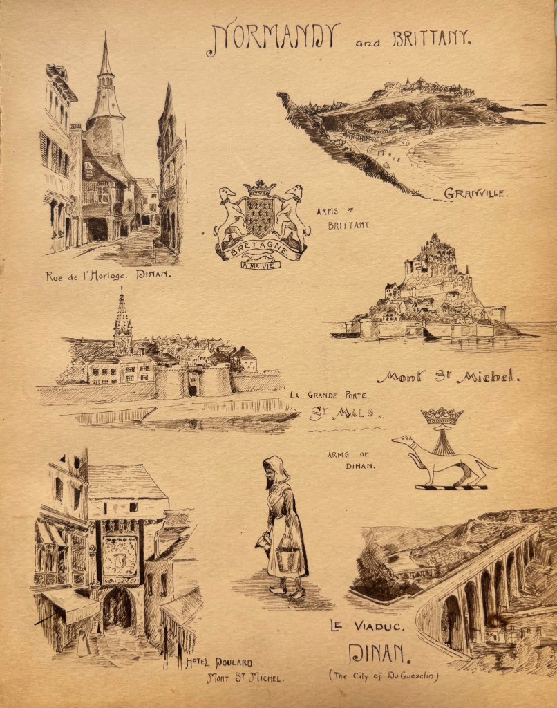 Making my way to the station I caught the 10.35 to Granville – changing at Folligny. Arrived at Granville about 12 o’clock – went to Hotel de Paris. Landlord’s daughter spoke English. Walked about the town in afternoon, saw various things to interest me – washerwomen at public “Lavoirs” laughed muchly at me while I stood watching them. I then walked out on the promontory towards the Old church, which is placed in a very exposed position, & looks well weather beaten. Passed thro’ gateway of the old walls, & thro’ a dirty part of the town, en route to the Church. There are some large Barracks close to the Church. – I sat up on the cliff watching the soldiers & generally enjoying the rest, until the rain came down. It was only a shower however, & I started for the beach when it was over.