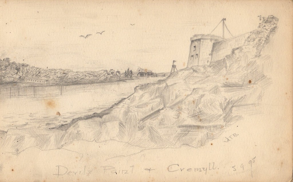 Friday Sept 6th Still raining but cleared up in the afternoon. We took the boat from the Pier @ 3 o’clock for the Weir Head. – a trip of 22 minutes up the river Tamar. We had already been up as far as Saltash, by the circular trip – but we found plenty to interest us. Beyond Saltash for some distance, there are plenty of Government vessels, and the river is very wide.