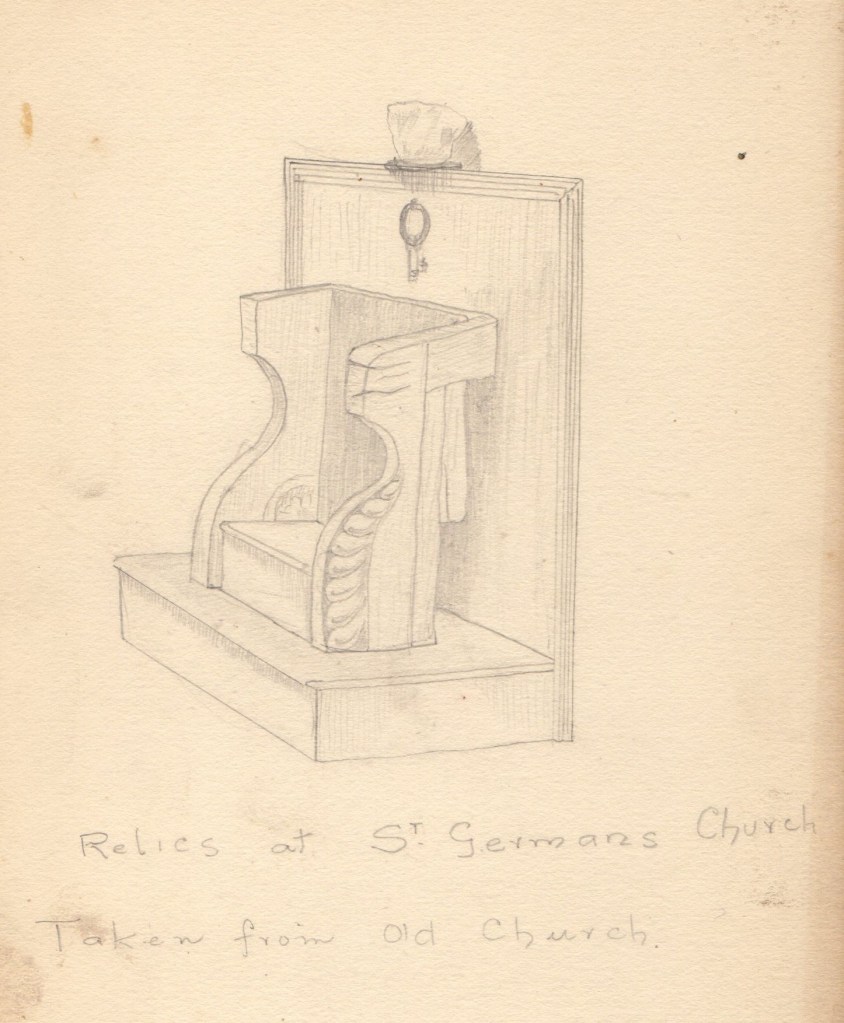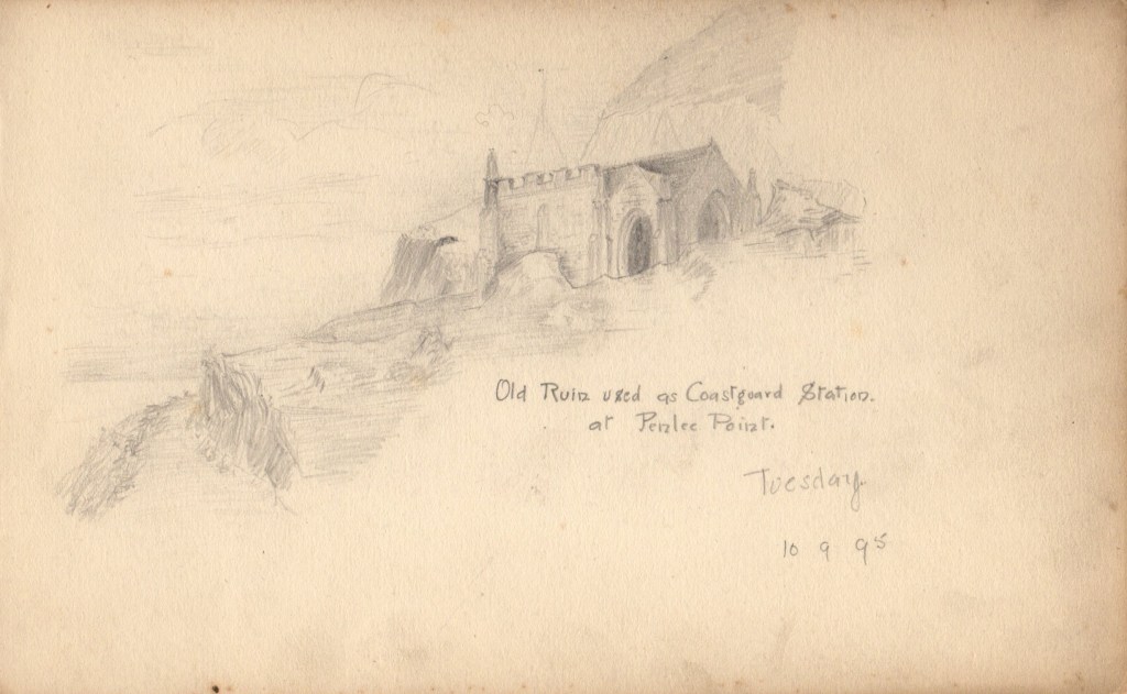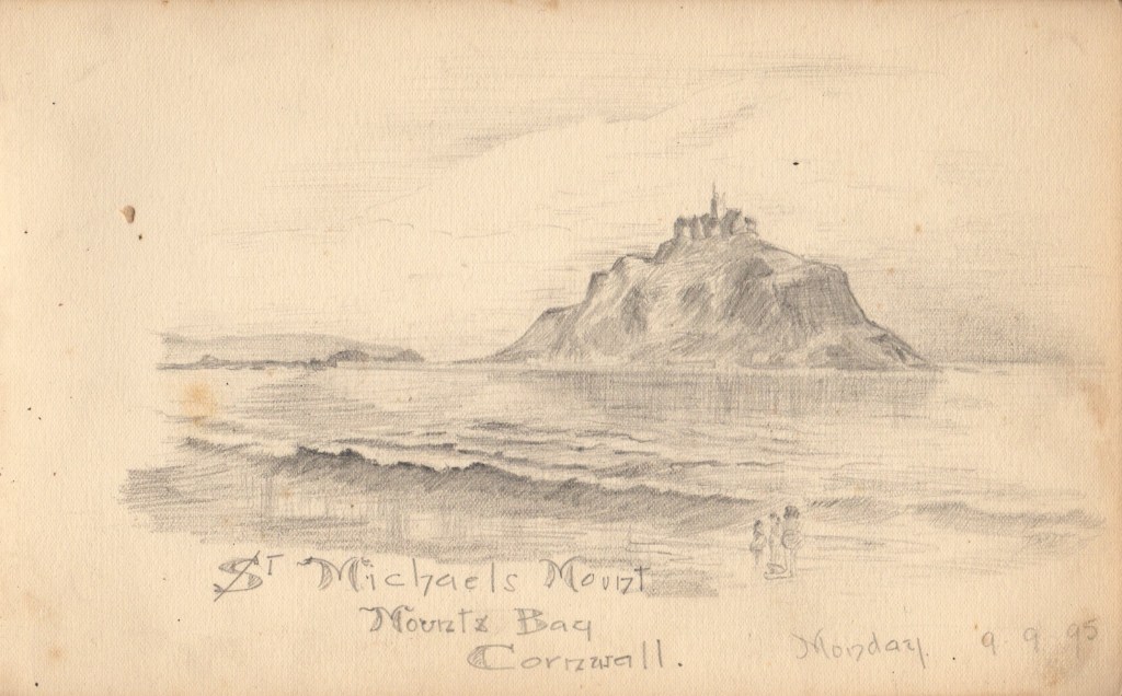 After climbing the somewhat steep paths of the Mound. we were admitted to the Castle. – the property of the St. Levans. Ascending the turret staircase in the church, we stood on the highest part of the building, we obtained a good view of Mounts Bay, & the Lizard. A part of the tower parapet is fashioned into a seat, and known as “St Michael’s Chair”. Edie managed to get into it, but it was in too perilous a position, for the other members of the family.