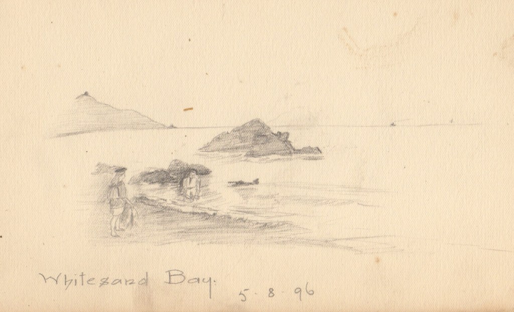 Friday. This morning I engaged a seat on one of the famous Jersey cars, – to Plemont, – in the north west of the Island. Driving thro’ lovely scenery, our first stop was at St Peters Vineries, where I sampled some of the luscious fruit. On again to Plemont, where I had dinner before descending to the shore.