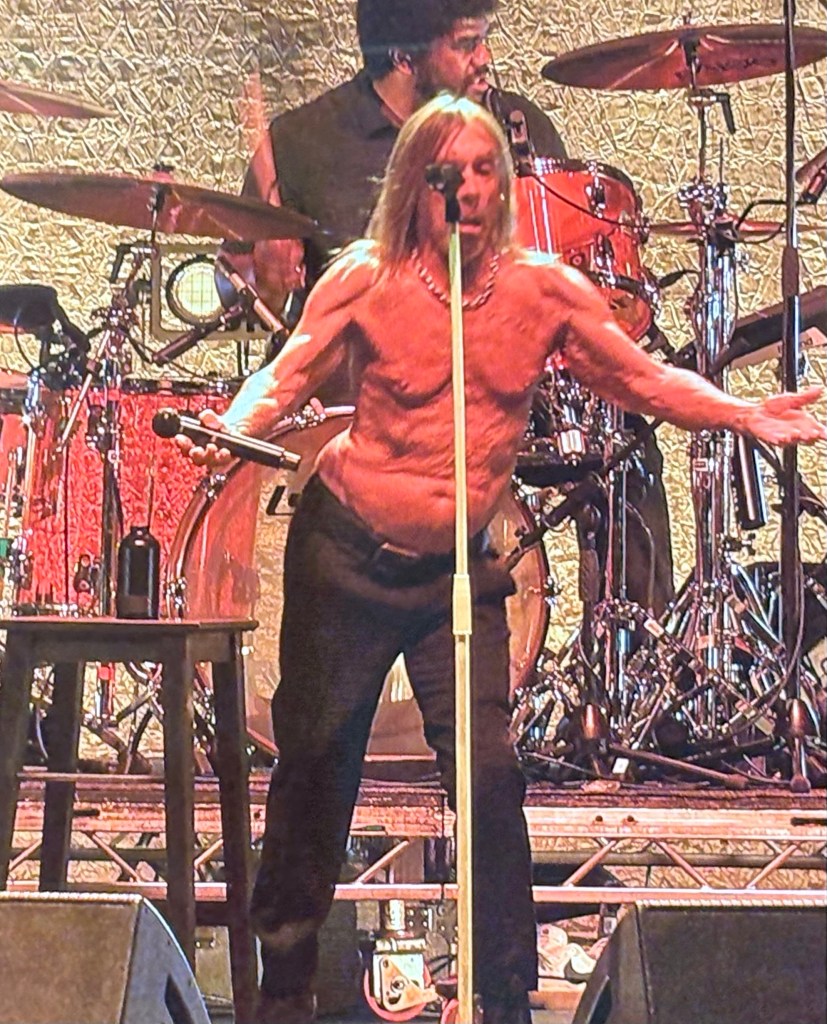 Once on stage, though, he was a wild beast. The crowd, a very broad spread of ages, greeted him as the returning hero which he is: the last survivor of the three godfathers of punk, since we lost Bowie and Reed. As usual his jacket lasted about thirty seconds before he cast it aside and we were treated to a full view of that torso on the big screen, his trousers as low slung as any teenager would dare. And those gleaming American teeth, conjuring an image of Iggy obedient and passive in the dentist’s chair.